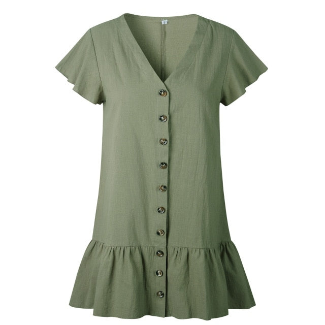 Solid Casual Mini Dress Sexy V-Neck Short Sleeve Ruffle Buttons Women 2018 New Summer Dresses Cotton White Dress Female Vestidos