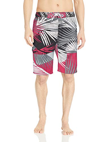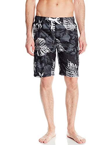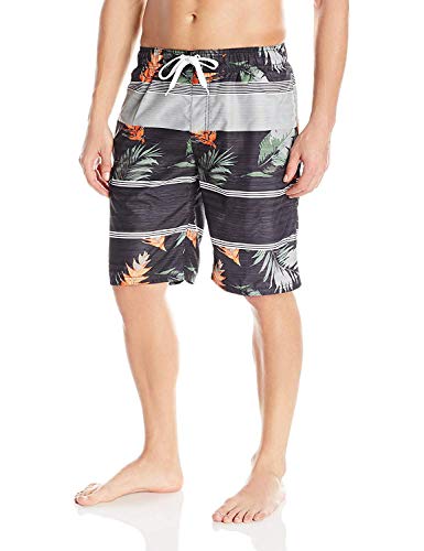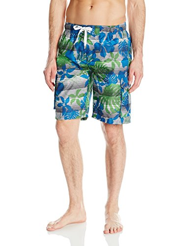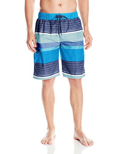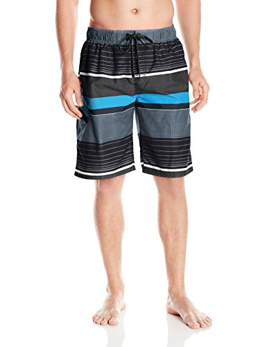 - Swim trunk featuring elasticized waistband with drawstring and contrast side stripes